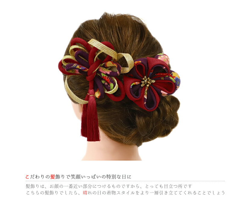 髪飾り 成人式 前撮り 振袖 袴 4点セット 花 赤 ワインレッド 紫 金 ちりめん つまみ細工 玉飾り 組紐 房 房付き かんざし 簪 和 和装 日本製 おしゃれ 大きい 可愛い 大人 大人可愛い 粋 ヘッドドレス 卒業式 結婚式 入園式 卒園式 謝恩会 七五三 浴衣 パーティー お祭り ハンドメイド 手作り No.9-4928 サイズ表 ≪コーム飾り≫ 縦 約15cm(房を含む) × 横 約11cm × 高さ 約4.5cm ≪つまみ細工Uピン飾り≫ 縦 約7.5cm × 横 約7.5cm × 高さ 約4cm ≪玉飾りUピン飾り≫ 大 玉の直径 約3.5cm × 小 玉の直径 約2.5cm ※飾り部分のみ計測しています。