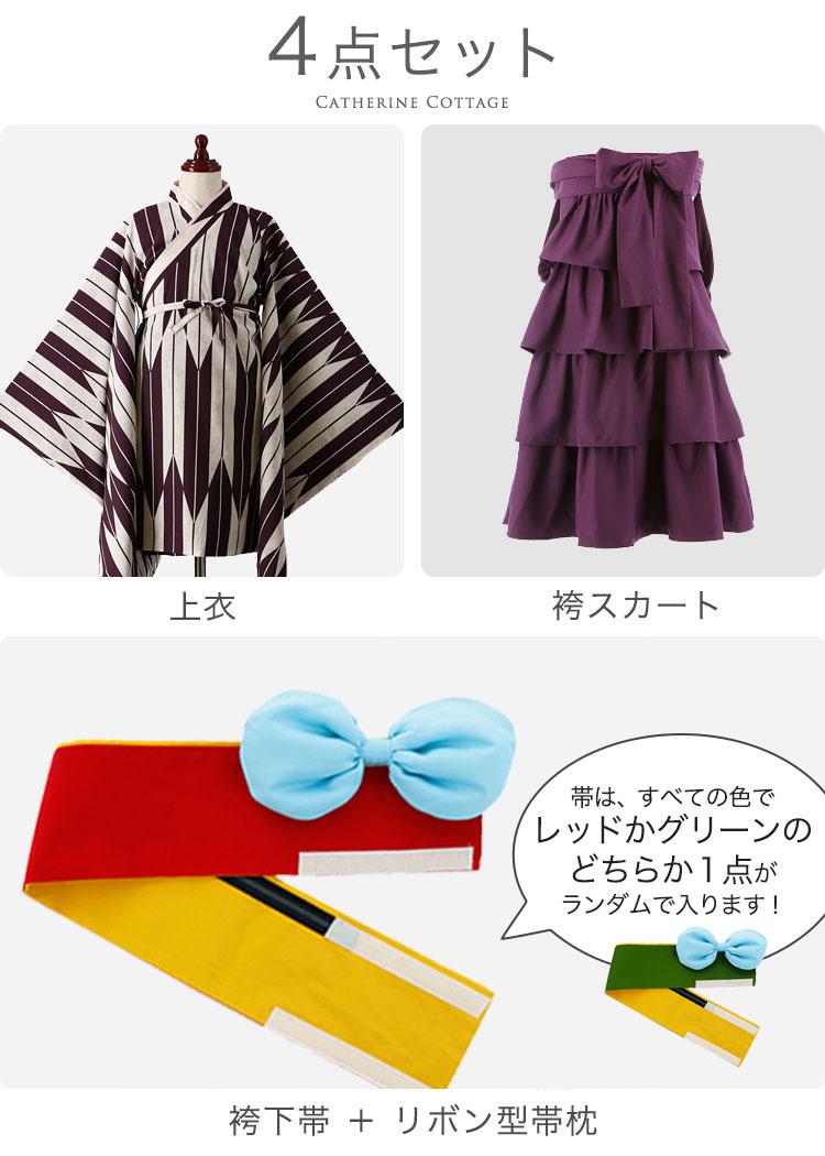 ITEM SPEC セット内容 上衣・袴下帯・袴(スカート型)・帯枕 サイズ 上衣 後丈 裄丈 たもと長さ 身幅 紐長さ 110cm 60 52.5 63 40 60 120cm 65 57.5 68 42 65 130cm 70 62.5 73 44 70 140cm 75 67.5 78 46 75 150cm 81 73 84 49 80 160cm 87 78.5 90 52 85 袴 前着丈 (ベルト下) 後着丈 (ベルト下) 前脇ベルト ゴム上がり 110cm 54 59 26 120cm 60 65 27 130cm 66 71 28 140cm 72 77 29 150cm 79 84 30.5 160cm 86 91 32 帯 胴回り寸法 110cm 56.5〜64.5cm 120cm 59.5〜67.5cm 130cm 60.5〜68.5cm 140cm 62.5〜70.5cm 150cm 66.5〜74.5cm 160cm 69.5〜77.5cm 単位(cm) ※ウエストはリボンとボタンで調節可能です。